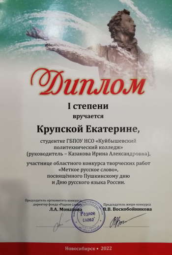По итогам конкурса обучающаяся ГБПОУ НСО «Куйбышевский политехнический колледж» группы 1517 специальности «Строительство и эксплуатация зданий и сооружений» Крупская Екатерина заняла 1 место в номинации «Живой как жизнь: новый смысл» (педагог-наставник: преподаватель русского языка и литературы Казакова Ирина Александровна).