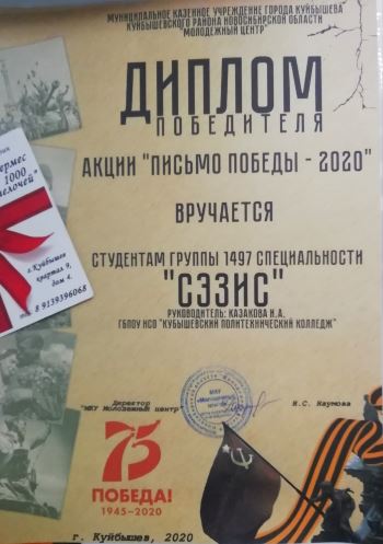 Обучающиеся ГБПОУ НСО «Куйбышевский политехнический колледж» химико-строительного отделения на протяжении нескольких лет являются активными участниками акции «Письмо Победы», организатором которой выступает МКУ «Молодёжный центр» г. Куйбышева.