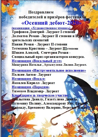 Традиционный фестиваль «Осенний дебют» в этом году, в связи со сложившейся эпидемиологической ситуацией, прошёл в он-лайн формате Ichbin 09.11.2020 Комментариев к записи Традиционный фестиваль «Осенний дебют» в этом году, в связи со сложившейся эпидемиологической ситуацией, прошёл в он-лайн формате нет