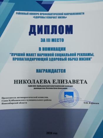 По итогам конкурса Николаева Елизавета (группа 1505 «ЭХП») удостоена Диплома Победителя за 3 место в номинации «Лучший макет наружной социальной рекламы, пропагандирующий здоровый образ жизни».