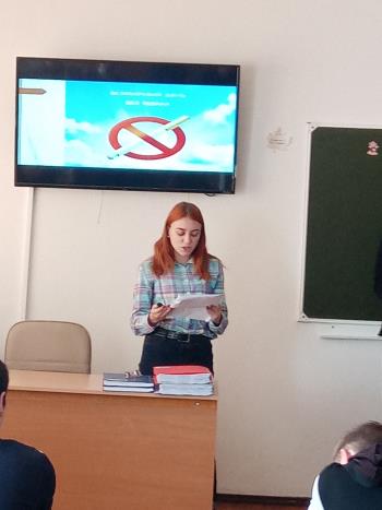 В ГБПОУ НСО «Куйбышевский политехнический колледж» преподаватель – организатор ОБЖ Легачева Алла Алексеевна подготовила для обучающихся внеклассное мероприятие «Мы – за жизнь без табака», приуроченное к Международному дню отказа от курения.