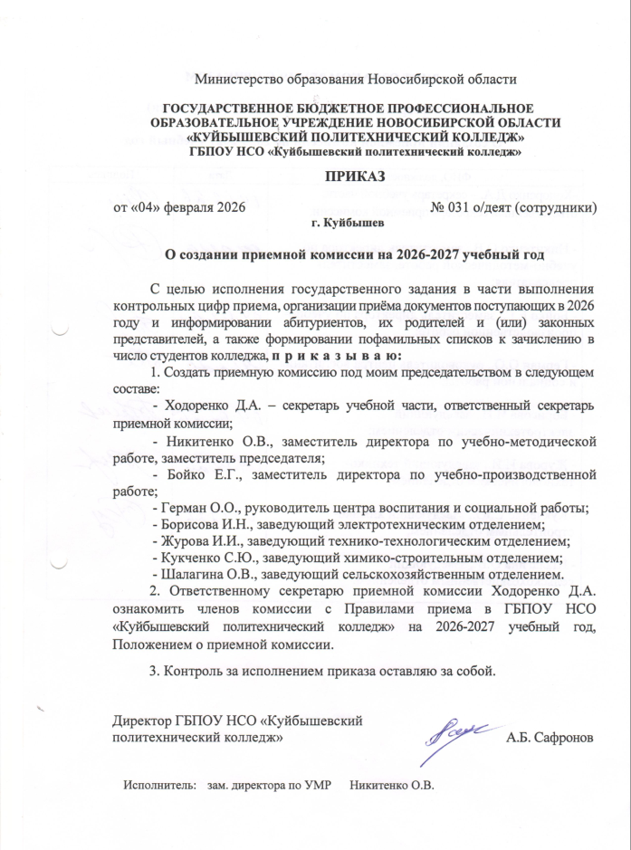 Приказ №031 от 04.02.2026 г. «О создании приемной комиссии на 2026-2027 учебный год»